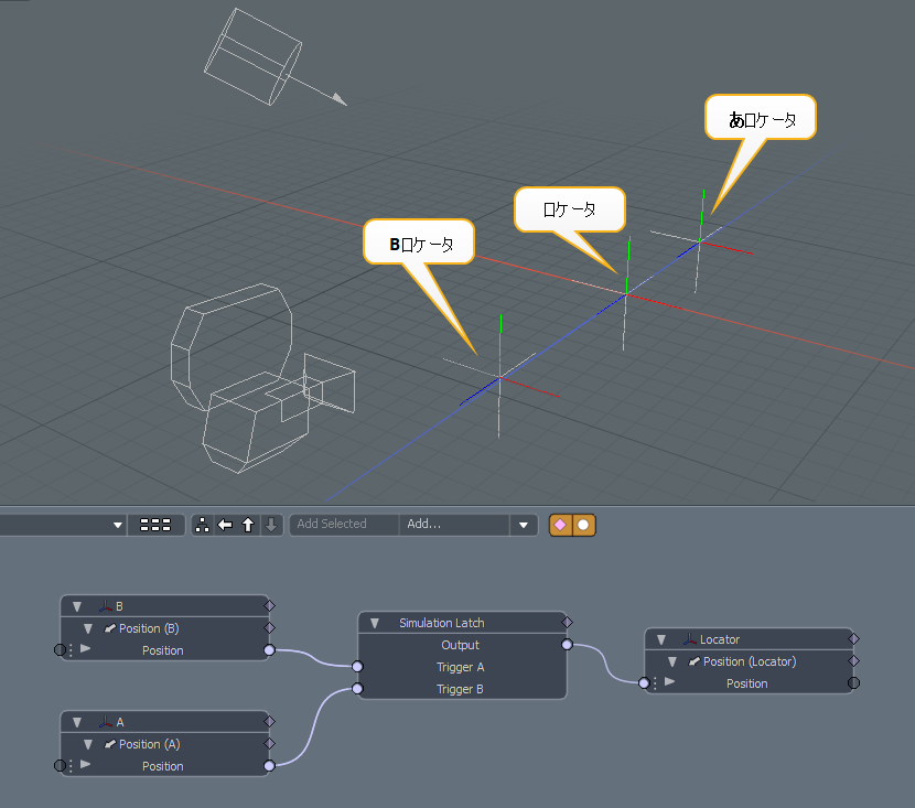 シミュレーション修飾子Output 3Dビューポートの中央でロケータを駆動しています。2つのトリガーがあります。 AそしてBロケーター。