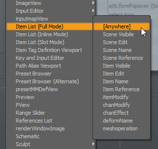 このオプションを使用すると、 Modoショートカットは、たとえば、アイテムまたはコンポーネントの選択モード、または特定のレイアウトでアクセスできます。デフォルトでは、 (contextless)、つまり、ショートカットは任意のモードまたはレイアウトで使用できます。