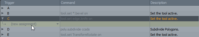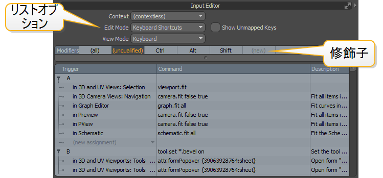 デフォルトでは、 Input Editorすべてのキーボードショートカットのリストを表示しますModo、すべてのコンテキストとビューポートを含みます。上部のリストオプションを使用して、表示する情報を変更できます。