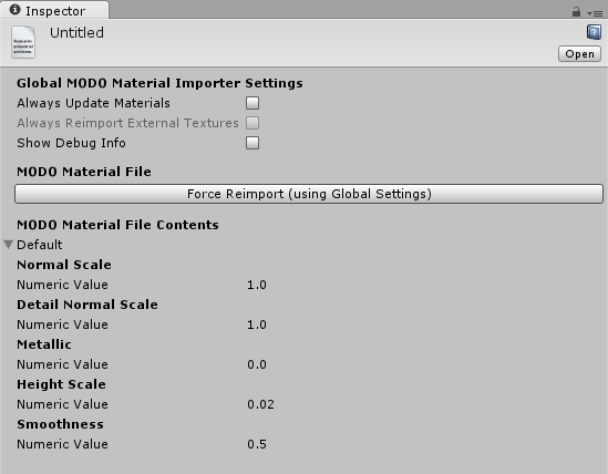 スクリプトには2つのグローバルオプションがあります。これらを開くには、 .xmlからエクスポートされたファイルModo Unityのインスペクターで。のInspector画面の右側にタブが表示されます。これらのオプションはすべてに影響します.xml選択したファイルだけでなく、ファイル