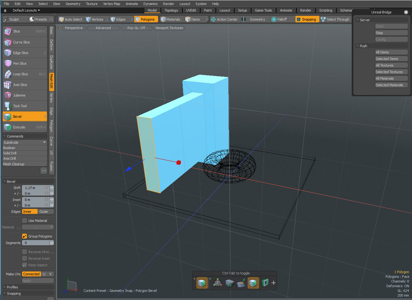 この手順では、ポリゴンの選択を変換するプロセスについて説明しますModo、ベベルツールを使用して、変更をアンリアルに転送します。