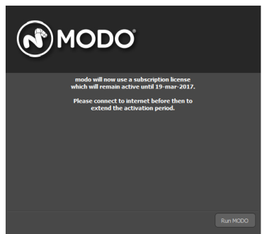 注意: ライセンスは30日間有効です。アクティベーション期間を延長するには、少なくとも30日間インターネットに接続していることを確認してください。ライセンスのアクティベーション期間は、 > メニュー。Modo