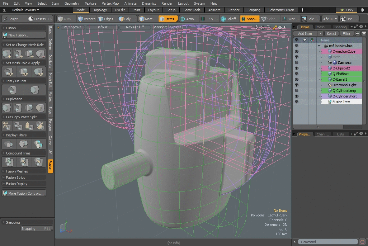 Fusionアイテムの複製とインスタンスを作成し、従来のModoツールを移動、回転、スケーリングするための変換ツール。変換ツールの詳細については、次を参照してください。 アイテムを変える。
