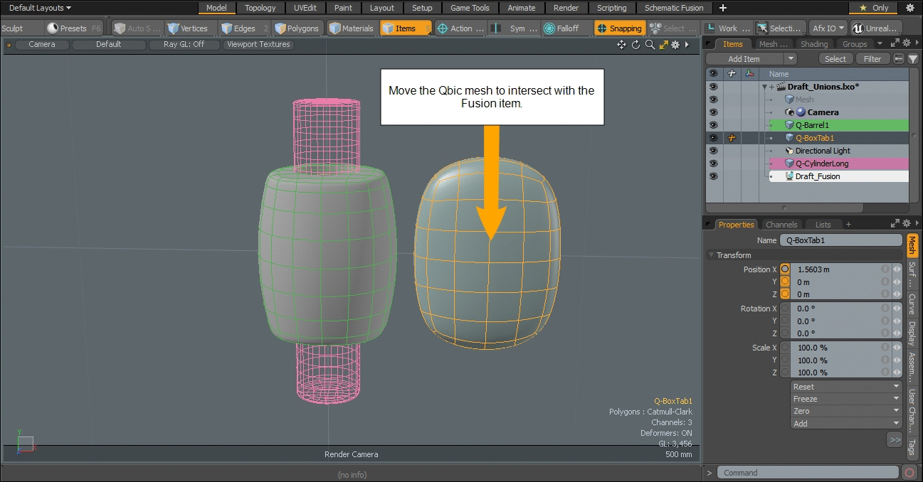 | 5. | 選択するQ-Barrel1そしてQ-CylinderLong次に、Toolbox Fusionタブで、 New Fusion > New Fusion with Selected Meshes。 |
