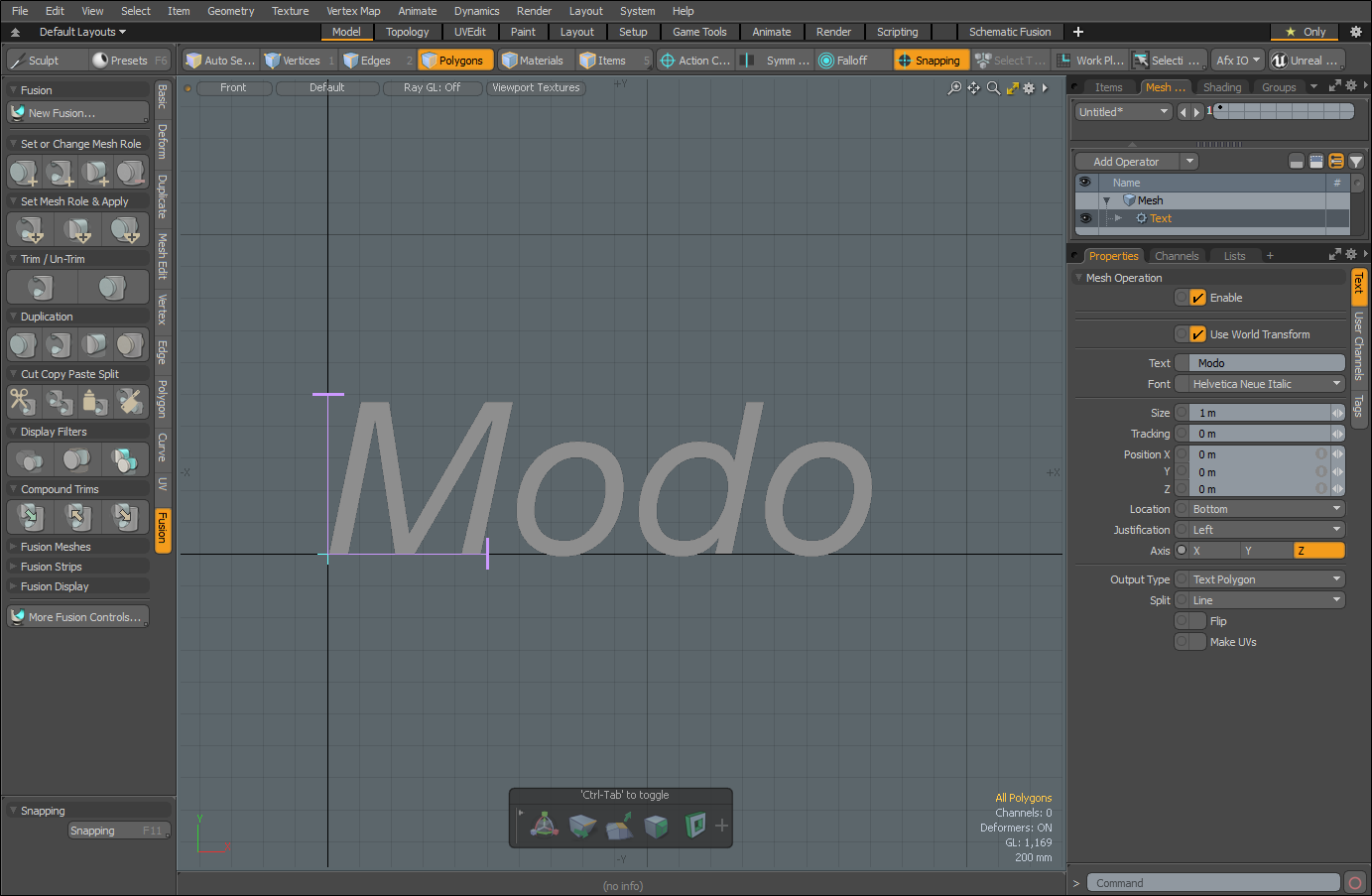 使用されるフォント、サイズ、カーニング量などに関するすべての情報を格納するポリゴンタグの形式でメタデータを含むテキストポリゴンが作成されます。テキストがこのテキストポリゴンのままである限り、 Textツールはテキストポリゴンを選択した状態で再度アクティブにでき、これらの属性はすべてライブで編集できます。たとえば、テキストポリゴンがベベルまたは押し出されている場合、 Modoそれらを「面」ポリゴンに変換し、テキストメタデータを削除します。