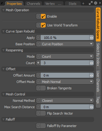 これにより、Curve Rebuild Spansメッシュ操作がMesh Operationsリストに追加され、右下のパネルにそのプロパティが開きます。