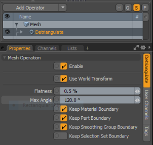 • 手続き型モデリングの場合、 Detriangulate ツールは、 Mesh Opsタブ。クリックAdd Operatorそして選択Mesh Operations > Polygons> Detriangulate。