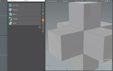 3つ以上のポリゴンで共有されるエッジの場合、 Modoポリゴンをペアにグループ化し、ペアの一部ではないポリゴンを無視して、各ペアの間に新しい面を作成します。3つ以上のエッジ間の接合部に、押し出しによって作成されたギャップを埋めるために追加のポリゴンが挿入されます。エッジのベベル時に形状を閉じて平面に保つために、エッジの裸の端に追加のポリゴンも挿入されます。