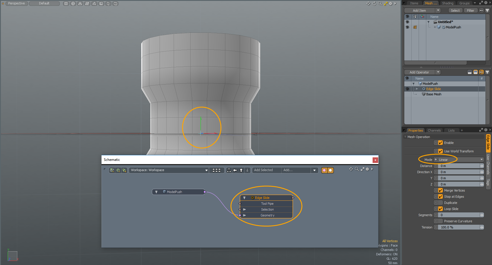 手続き型の使用Edge SlideのツールSchematicビューポートを使用すると、選択したメッシュ要素を接続されたエッジに沿って押すことができます。