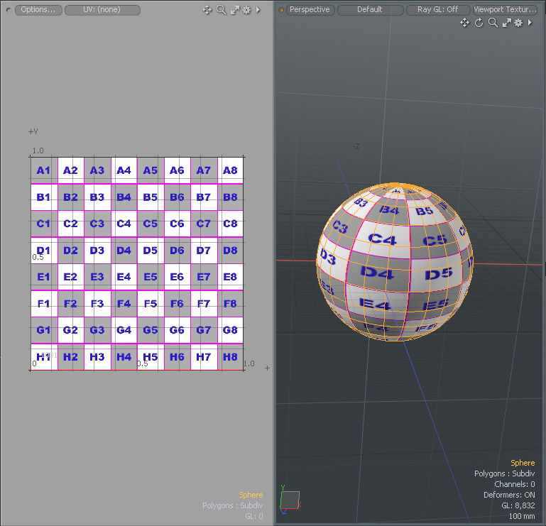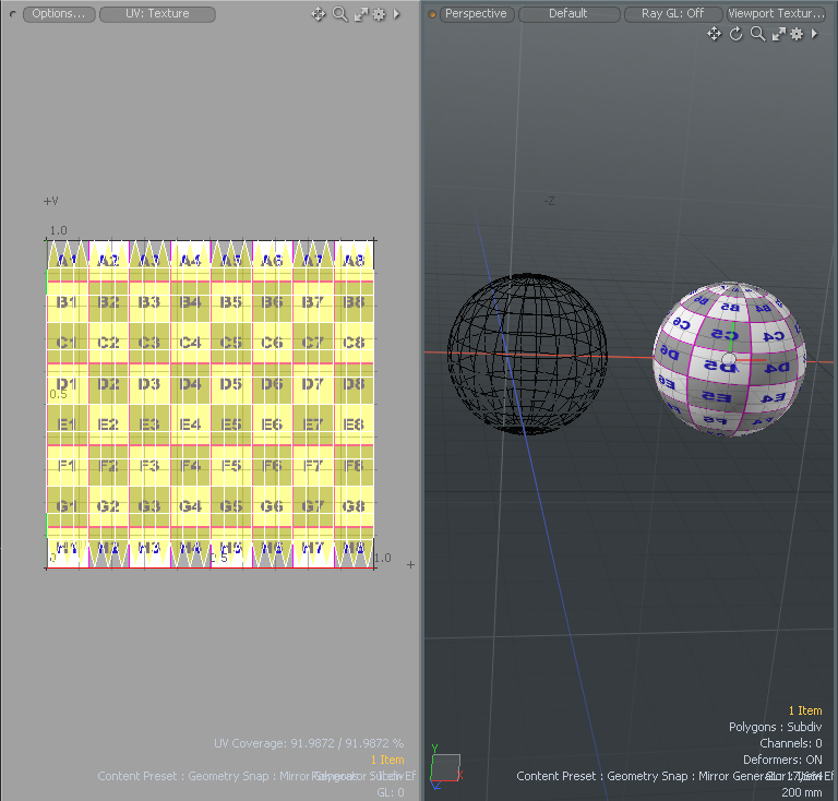 | 8. | アプリケーションメニューから、 Items選択モードで、次にミラーリングされた球のUVをUV Viewport。 |