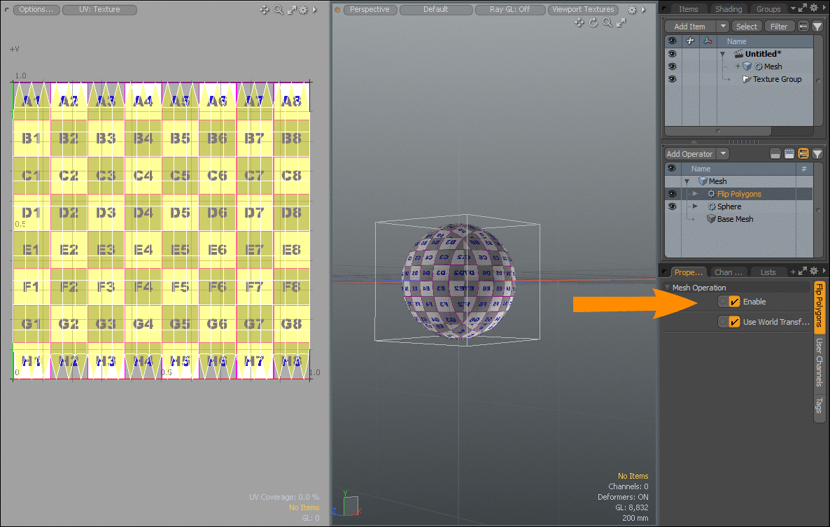 ポリゴンのフリップツールを使用すると、ポリゴンの法線をすばやく反転して、作業中にUVを修正するのに役立ちます。 UV Viewport。メッシュアイテムまたはサーフェスポリゴンの選択を選択して、 Flip Polygonツールをオフおよびオンにして結果を確認します。手続き型メッシュ操作Flip Polygons、をクリックして見つかりますAdd Operatorそして拡大Mesh Operations > Polygons。