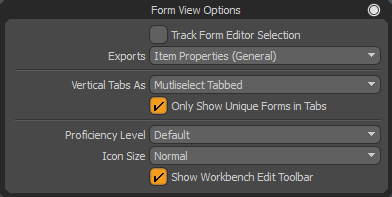 このオプションは、フォームに表示される詳細レベルを変更するために使用されます。 • Default -を使用Base Form Proficiency Levelフォームの好み。詳細については、 デフォルト設定。 • Basic -一般的なコアプロパティの短いリスト。 • Standard -すべてのコアプロパティのリスト。 • Advanced -すべてのコアプロパティと特別な動作のカスタム関数のリスト。 |
