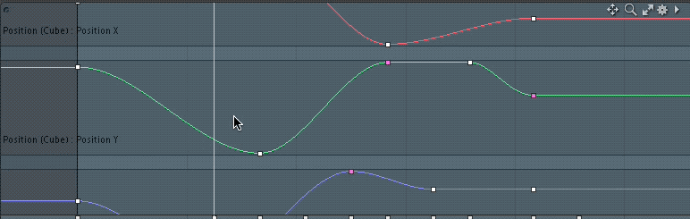 紫色の速度曲線がエディタに表示されます。下の画像は、選択したPosition X そして Position Yチャンネル。