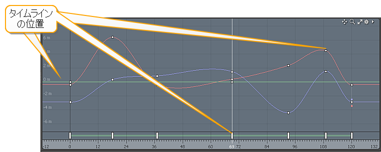 下部のタイムラインは機能的にはタイムラインの中にAnimationレイアウト。クリックしてドラッグすると、現在の時刻が変更されます。現在の時間値をドラッグすると、3Dビューポートでアニメーションカーブの効果を確認できます。ハンドルは、タイムラインのキーフレームが表示される場所に表示され、クリックして前後にドラッグすると、選択したチャネルのキーフレームの位置を変更できます。