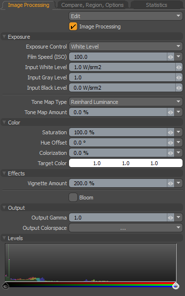 画像に適用する露出プリセットを設定します。 • White Level -レンダリングされた画像の純粋な白に対応する輝度(照明の明るさ)の量を定義します。 Input White Level値。 • Photographic -に類似した結果を生成しますWhite Level、ただしFilm Speed (ISO)写真家にとってより身近な設定。 |