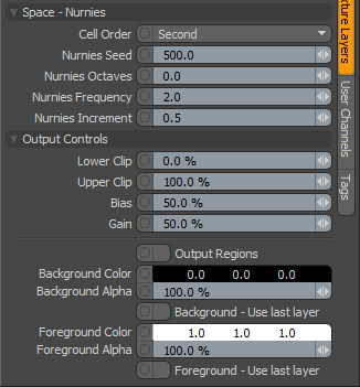 のNurnies textureは、で提供される多くの手続き的に生成されるテクスチャの1つです。 Modo。手続き型テクスチャはレンダリング時に数学的に作成されるため、解像度は固定されていません。細部の視覚的な損失なしに、ほぼ無限に拡大できます。のNurniesテクスチャは、その2つのゾーンで対処できます。 BackgroundそしてForeground色。テクスチャは、設定に基づいて1つのゾーンから別のゾーンに変調します。各ゾーンには、 ValueまたはColorそしてAlpha。適用されるゾーンは、 レイヤー効果テクスチャが適用される場所。たとえば、テクスチャをDisplacement、その後Modoを使用しますValue設定ですが、テクスチャ効果をDiffuse Color 、 Modoを使用しますColorそしてAlphaの設定BackgroundそしてForeground。このシェーダーは、ランダムなタイルタイプのパターンを作成します。これは、表面(宇宙船の船体など)に詳細を追加するのに役立ちます。