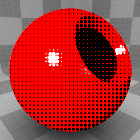 Halftone Materialターゲットサーフェイスをスタイリングして、滑らかなシェーディングを拡散カラー上に配置されたユーザー定義の黒いパターンに置き換え、新聞や雑誌に印刷された忠実度の低いイメージの外観をシミュレートします。
