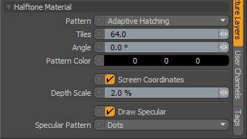 を使用して任意のサーフェスにマテリアルを追加できますAdd Layer下のメニューにあるシェーダーツリーの機能Custom Materials > Halftone Material。ラインの方向と輪郭は、で定義されたサーフェスのUVマップに依存する場合があります。 テクスチャロケータアイテムを有効にするか、 Screen Coordinatesオプション、ラインは単にユーザー定義に沿って従いますAngleフレームに対する相対値。