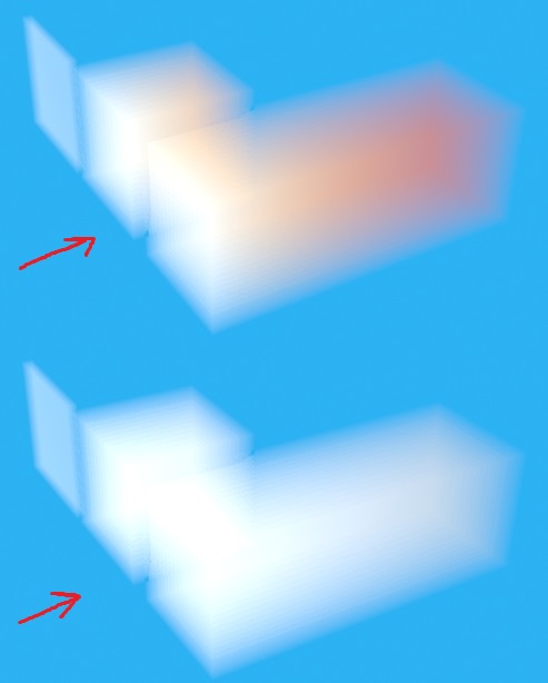上の例には200%の赤シフトが適用され、下の例には赤シフトが適用されていません。この画像の矢印は、光の方向を示しています。 |