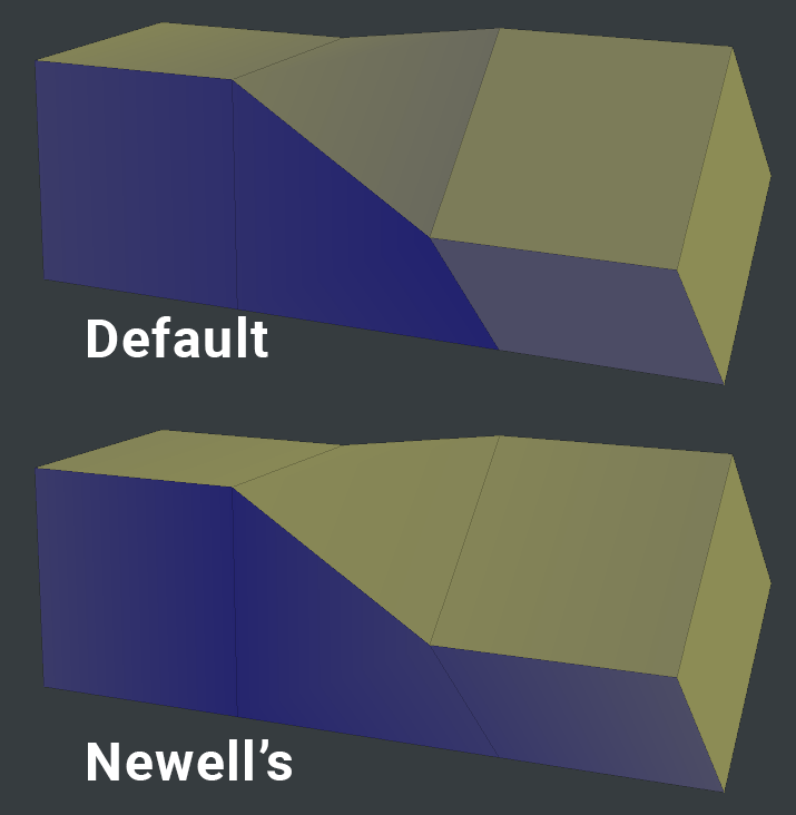 幾何学的な面の法線を生成する方法を指定します。 • Default -ポリゴンの最初の3つの頂点から法線を導き出します。 • Newells -より良い幾何学的な法線を計算します。計算コストは高くなりますが、非平面ポリゴンの方が見栄えがよくなります。