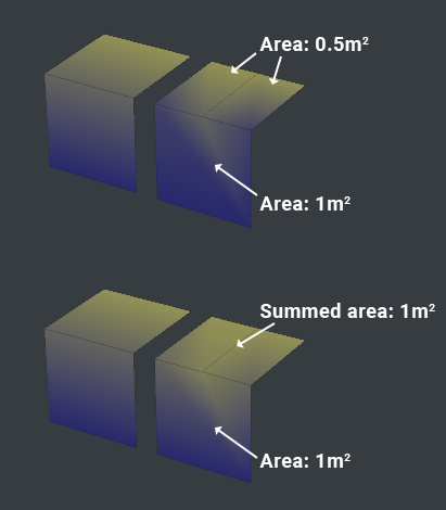 隣接する同一平面上のポリゴンの有効領域を合計します。面積を計算するとき、平坦度が低い接続されたポリゴンが1つの大きなポリゴンであると効果的に偽装します。