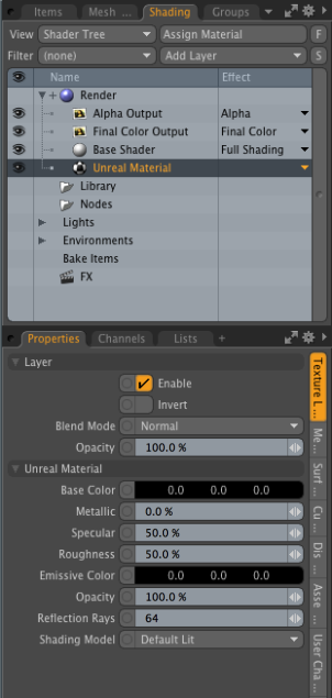 アンリアルマテリアルを作成するには、 Shader Tree、クリックAdd Layer > Custom Materials > Unreal Material。に材料が追加されますShader TreeとレイヤーのPropertiesパネルが表示されます。