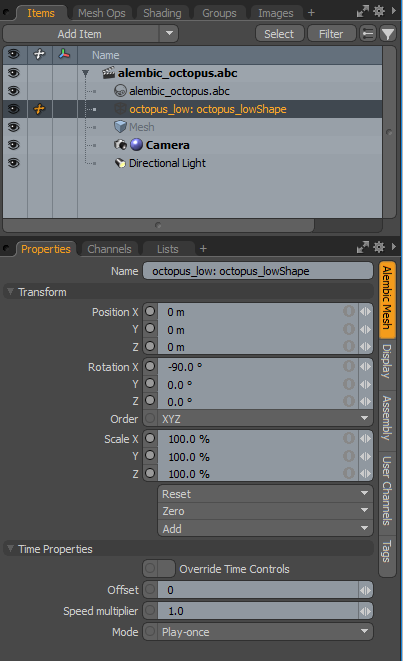 Alembicファイルがインポートされると、シーンで使用されるメッシュ、パーティクル、ラインの変換、時間、およびスケールプロパティを設定できます。次のオプションを使用できます。