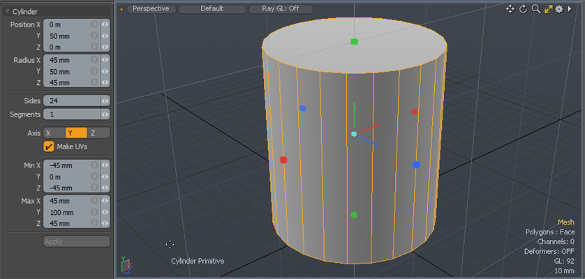 シリンダーのサイズをマグカップのサイズにほぼ一致するように調整し、ベースを地面(XZ)平面に配置します。マグカップの幅は約90 mm、高さは100 mmです。シリンダーのサイジングには、 Modoを使用しますRadiusプロパティは、全長の半分です。