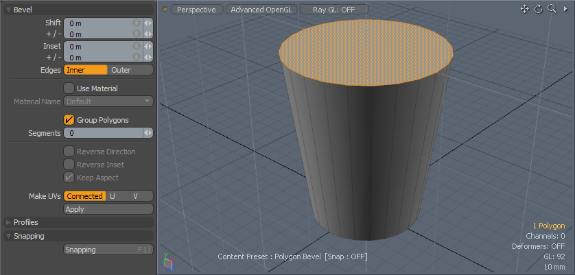 | 3. | シリンダーのPropertiesの左下のパネルModoインターフェースで、次のようにプロパティを編集します。 |