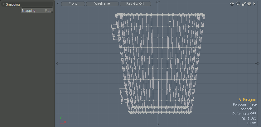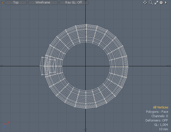 にModo作業平面は薄い灰色のグリッドとして表示されます。上の図では、作業面がXY平面に位置合わせされています。ビューポートを回転させて、作業平面がどのように変化するかを確認してください。