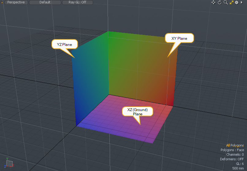 • 地面: Modo 3Dビューポートの向きを決めるために、地面に濃い灰色のグリッドを描画します。この表面は、地面またはXZ平面です。(平面は3D空間の平面です。)接地面は、XとZのすべての点を通過します(Y = 0)。