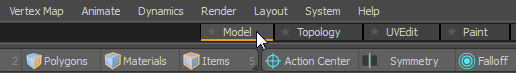 Modoでは、特定のタスクを対象としたツールセットを備えた複数のインターフェイスレイアウトを提供しています。レイアウトは、メニューバーのすぐ下にあるタブを使用して選択します。このチュートリアルでは、 Modelレイアウト。このレイアウトは、オブジェクトプリミティブ(単純な形状)を使用して3Dオブジェクトを作成するために設計されており、シーンの大きなパースビューを提供します。
