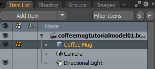 2. の中にShader Tree表示するには、マグの横にある下矢印をクリックして、 modo_logo。シーンに円柱が表示され、選択されます。