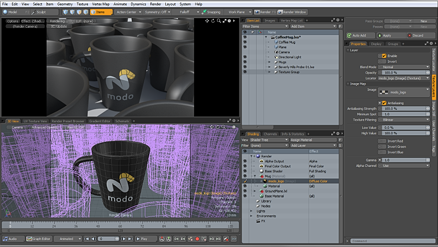 押すだけで十分簡単ですRenderこの時点でコーヒーマグの画像がありますが、特にデフォルトの設定では、それほど興味深い画像ではありません。単一のオブジェクトをレンダリングする場所がありますが、ほとんどの場合、シーンをModo、複数のオブジェクト、背景、およびいくつかの明確な照明。UVマップを割り当て、マグカップの表面を調整してクローンを作成し、プリセットを使用して基本的なシーンを作成してから、カメラとレンダーアイテムの設定を調整して最終的なレンダリングを作成します。
