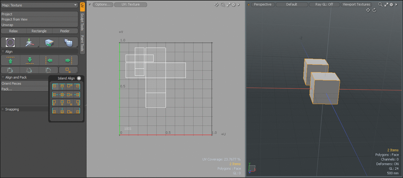 Modoは、選択したUVアイランドを一度に整列させる簡単なワークフローを提供します。