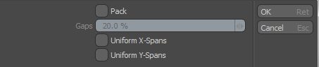 • Pack -結果の長方形のUVセクションを、オーバーラップすることなく、ターゲットUVスペース内に自動的に合わせます。Modo島をスケーリングすることでこれを行います。有効にすると、 Gaps値は、UVアイランド間の間隔の量を定義します。上記の3番目の例では、 PackデフォルトでGaps値。