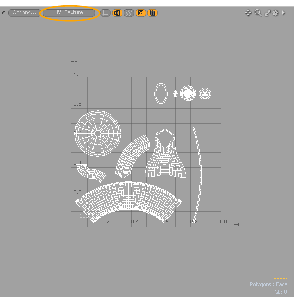 | 4. | UVビューポートで、 UV: (none)ボタンと選択Texture。 |
