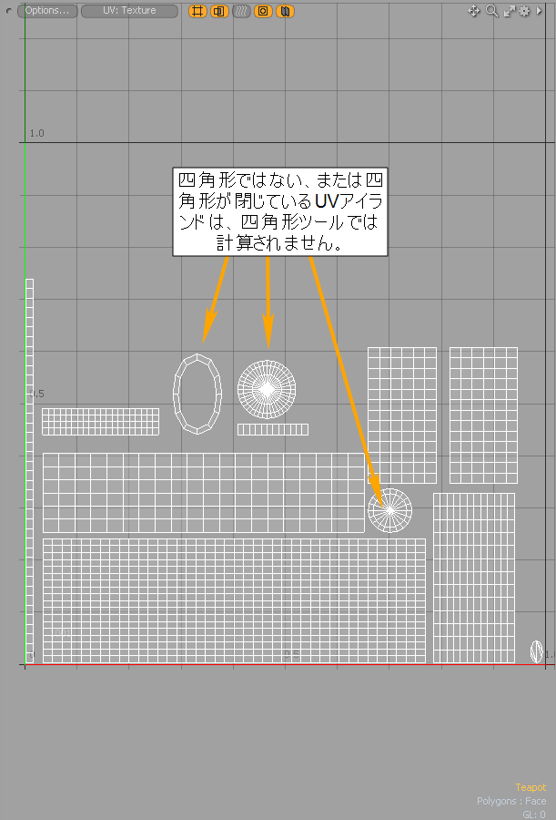 注意: 四角形ではない、または四角形が閉じているUVアイランドについては、UVビューにそのまま表示され、次のエラーメッセージが表示されます。クリックOKダイアログを閉じます。
