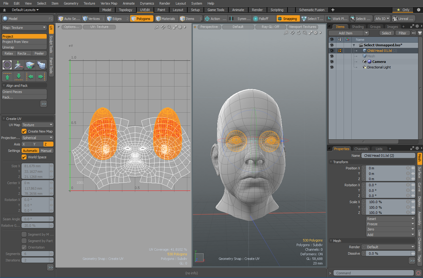 マップされていないポリゴンがUVマップに追加されます。適切なUVツールを作成プロパティ。