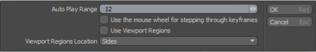 をクリックするgearオーバーレイのアイコンをクリックすると、ダイアログボックスが開き、 Auto Play Rangeは、マウスの中ボタンを押したときに再生される現在の時間の前後の歩数です。 チェックボックスを選択して、スクロールホイールを使用してキーフレームを移動することもできます。