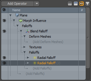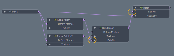以下の例では、 Blend Falloffモーフインフルエンスノード(Morphこの場合)、2つのラジアルフォールオフを組み合わせます。