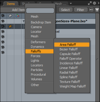 | 2. | 横の下矢印をクリックしますAdd Itemそして選択Falloffs > Area Falloff。 |