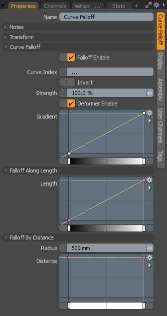 3.   曲線に沿った重みの決定に使用される勾配を指定するには、 Curve Falloffノード。