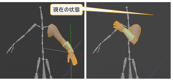 ジョイントが回転すると、そのパスが宛先の方向に影響します。たとえば、腕を前に向けた場合と上げた場合の向きは異なります。ツイスト、ヨー、ピッチの回転順序で、 Modo補正されたツイスト値を計算して、方向が宛先で同じになるようにします。 |