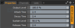 のADSR Envelope修飾子を使用すると、次の主要なプロファイルを定義できます。 Attack (上る・昇る)、 Decay (落ちる)、 Sustain (キーが押されている場合、キーはその位置を維持します)、およびRelease (アイドルに)。以下は、 Schematicビューポート。