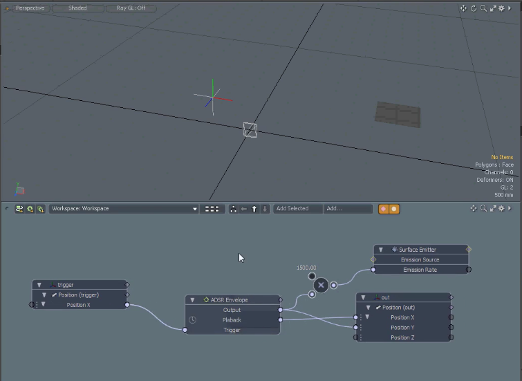 ロケーターは、アウトメッシュを制御するトリガーです。ロケーターがX軸の正の位置に移動すると、ADSRエンベロープがトリガーされます。