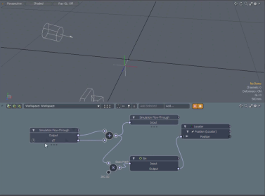 以下の例では、 PlusノードはInputシミュレーションフロースルーノードのOutput次のタイムステップの。dTタイムステップごとに追加され、増加する値が生成されます。このセットアップは、ロケーターアイテムの振動モーションを生成するリグにアタッチされます。
