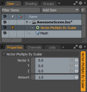 のVector Multiply by Scalar modifierはベクトルを取り、各コンポーネントに単一のスカラー入力を乗算します。たとえば、ベクトルが[1.0、0.5、0.25]で、スカラーが2.0の場合、出力ベクトルは[2.0、1.0、0.5]になります。