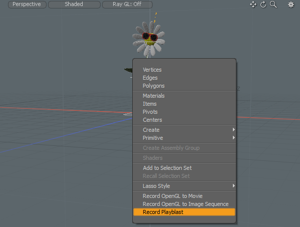 プレイブラストツールは、3Dビューポートのコンテキストメニューから使用できます。3Dビューポートで右クリックしてコンテキストメニューを表示し、 Record Playblast。