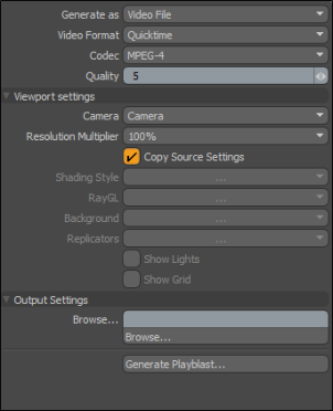 | ソース設定のコピー | 有効にすると、3Dビューポートから設定がコピーされます。の残りの設定Playblast Settingsダイアログはソースからコピーされたものを上書きします。この設定はデフォルトで有効になっています。 |